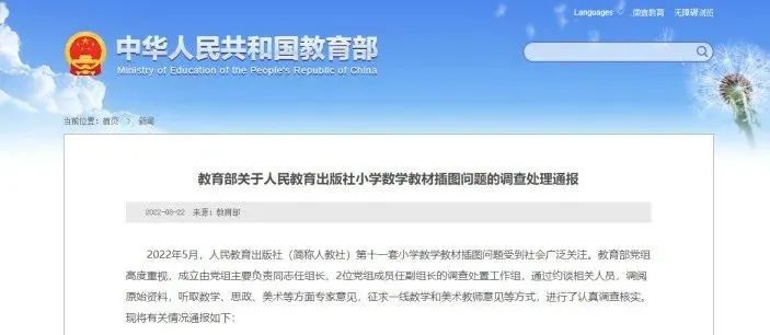 教育部通报关于人民教育出版社小学数学教材插图问题的调查处理情况