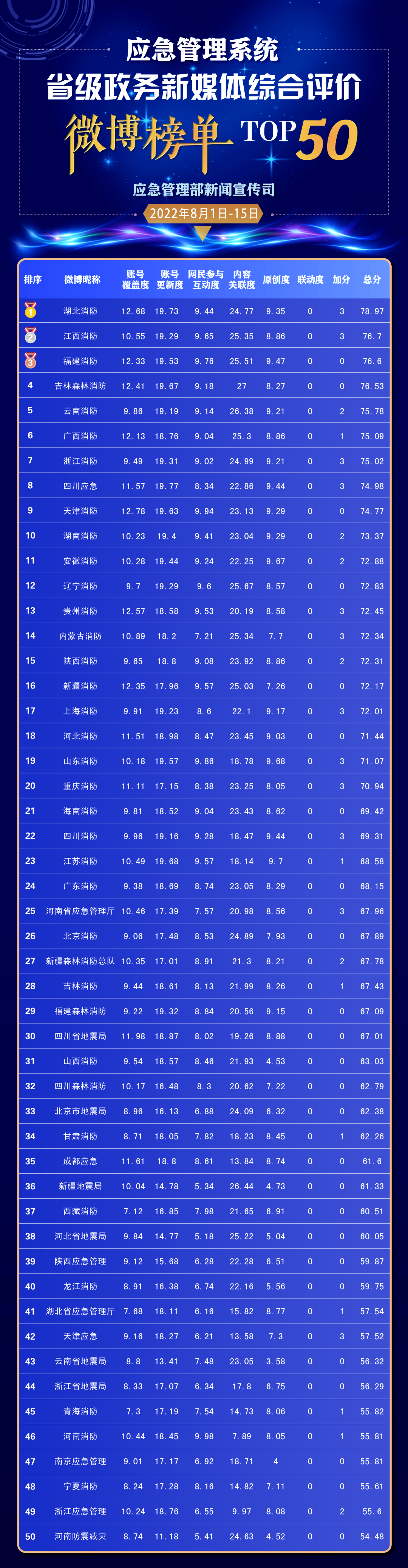 最新发布!应急管理系统省级政务新媒体综合评价榜单(8月1日~8月15日)