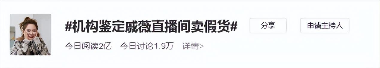 8月22日上午,机构鉴定戚薇直播间卖假货引热议,相关话题阅读量破2亿,1.9万讨论。