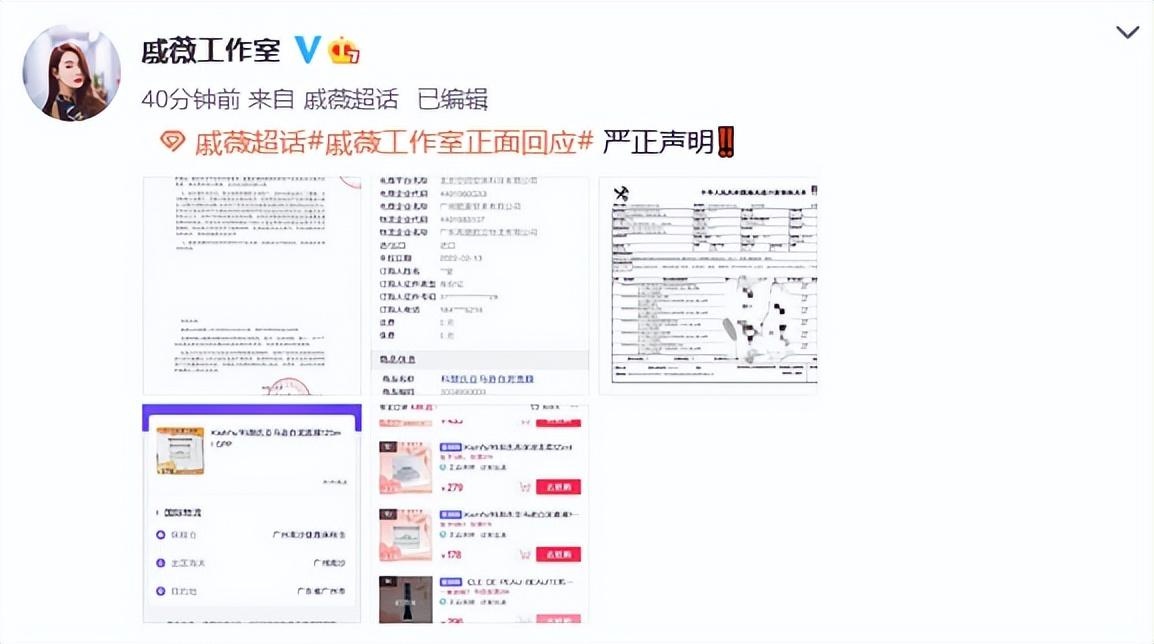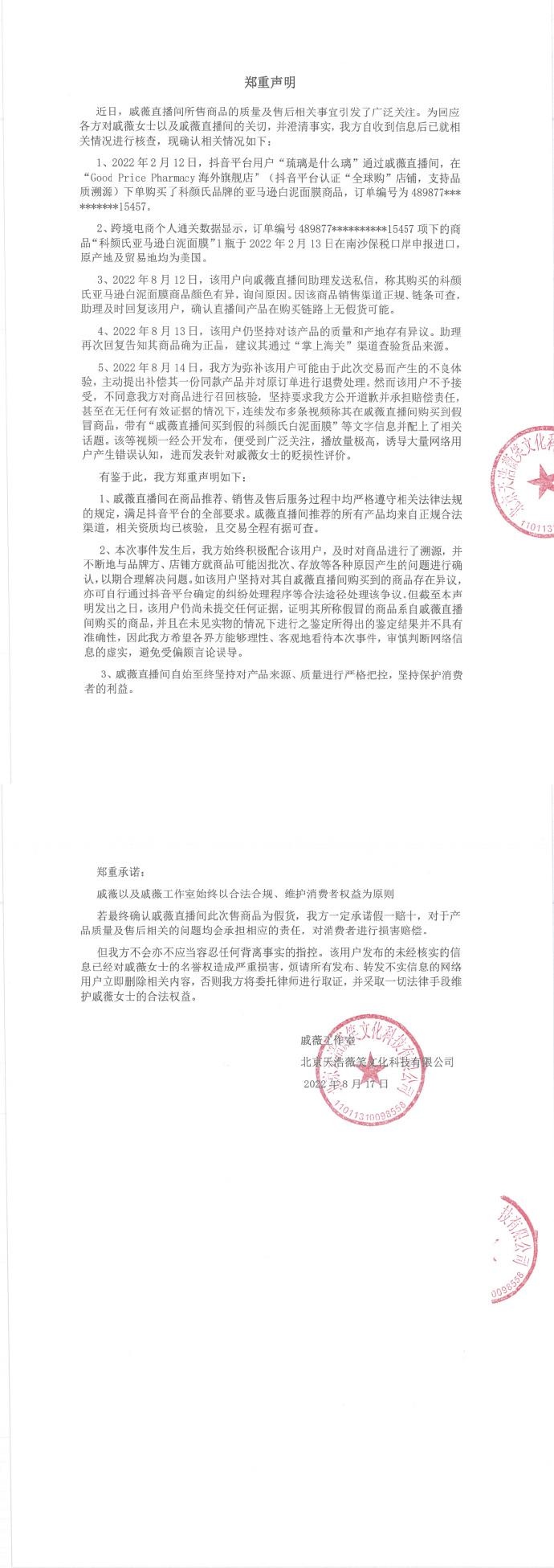 8月17日,戚薇工作室发布声明回应此事,称直播间推荐的所有产品均来自正规合法渠道。