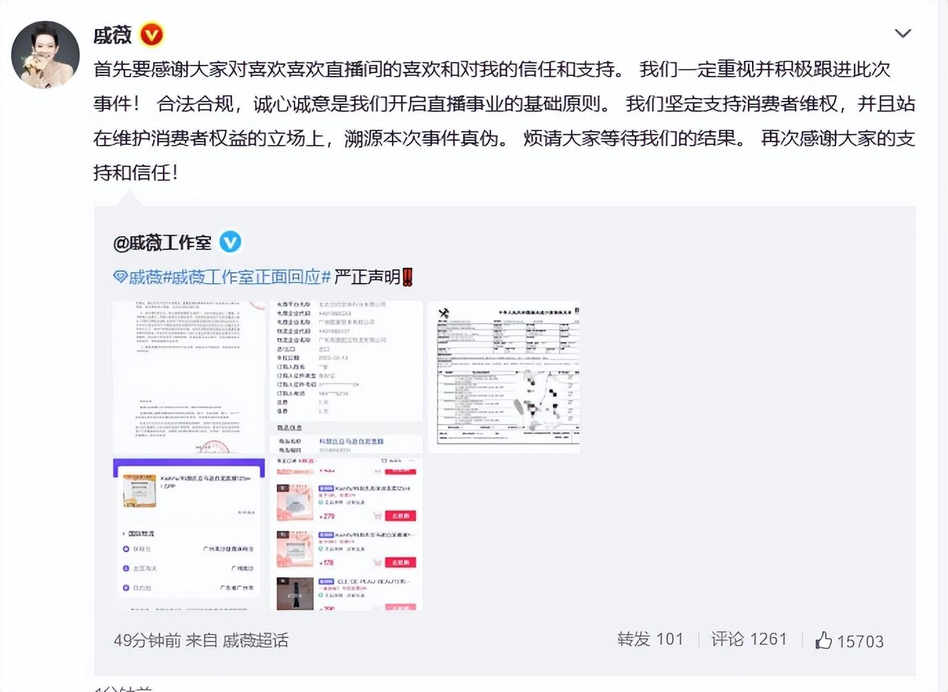 前几日,有网友在个人账号发文称在戚薇直播间购买的产品经过多次鉴定结果是假货,随后戚薇工作室否认卖假货,戚薇本人也转发声明称“我们一定重视并积极跟进此次事件”。