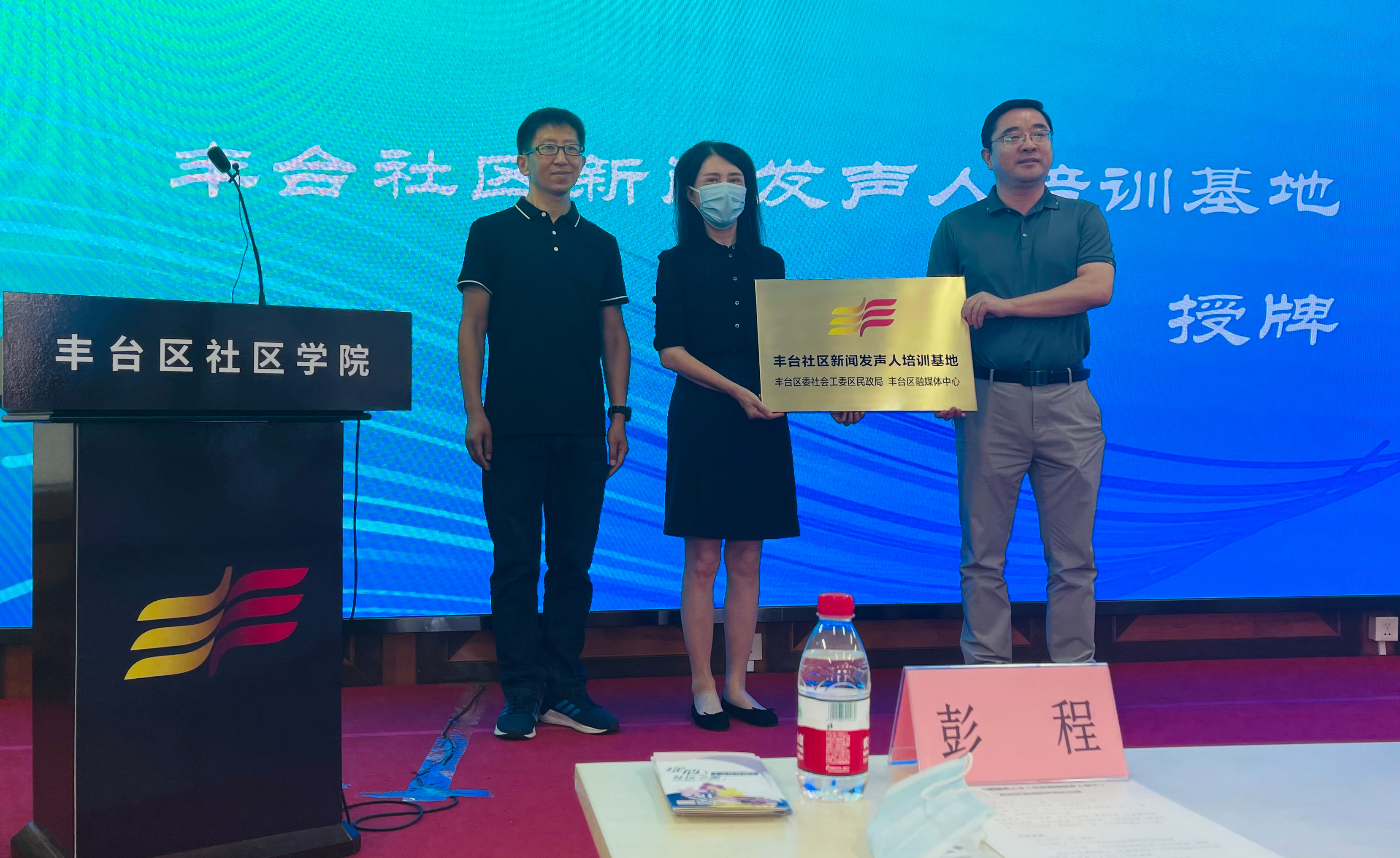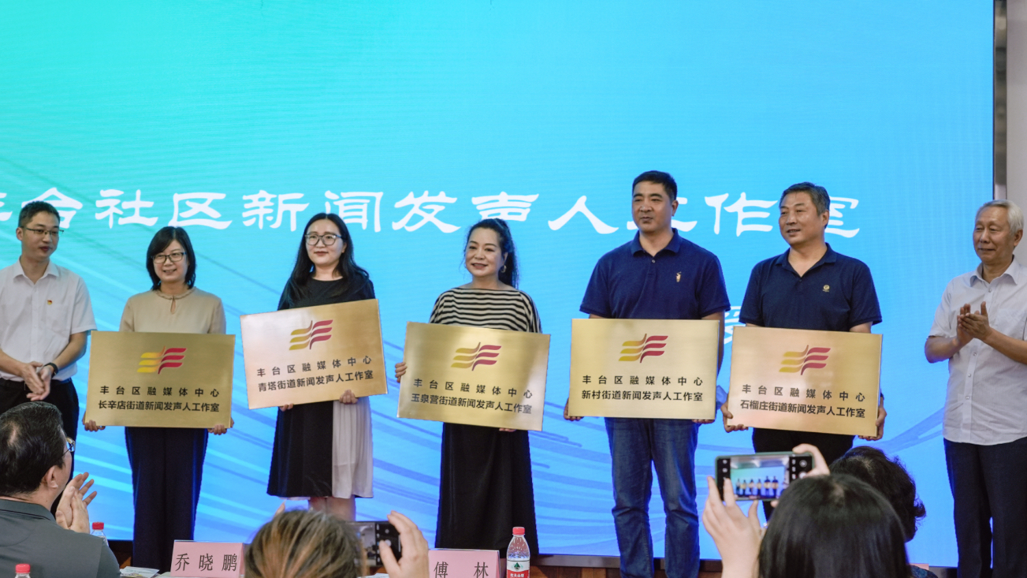 开班式上,丰台区委宣传部副部长、区融媒体中心主任乔晓鹏与区民政局副局长彭程为丰台社区学院授牌,这里将成为“丰台社区新闻发声人”培训基地,成为志愿服务人才队伍——丰台社区新闻发声人骨干培训的常态化阵地。现场还为特邀专家团和讲师代表颁发了证书。同时,现场各位领导和专家还一同为10个街道进行了“丰台社区新闻发声人工作室”授牌。