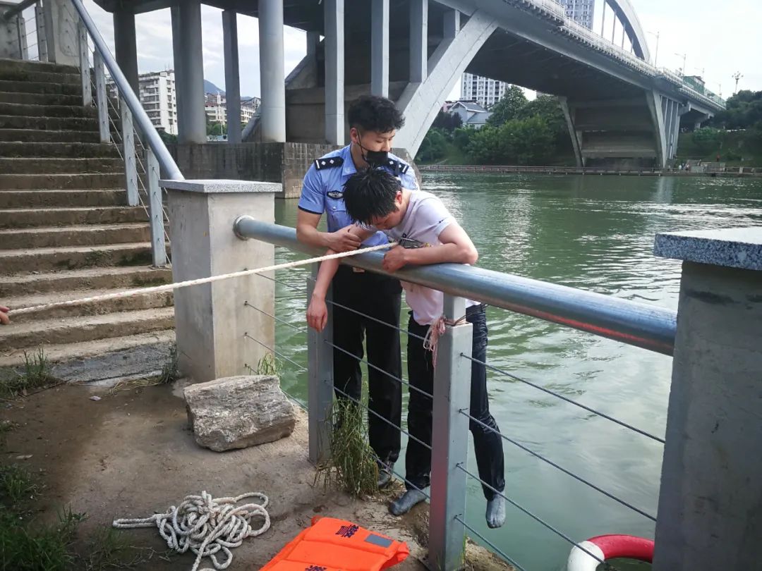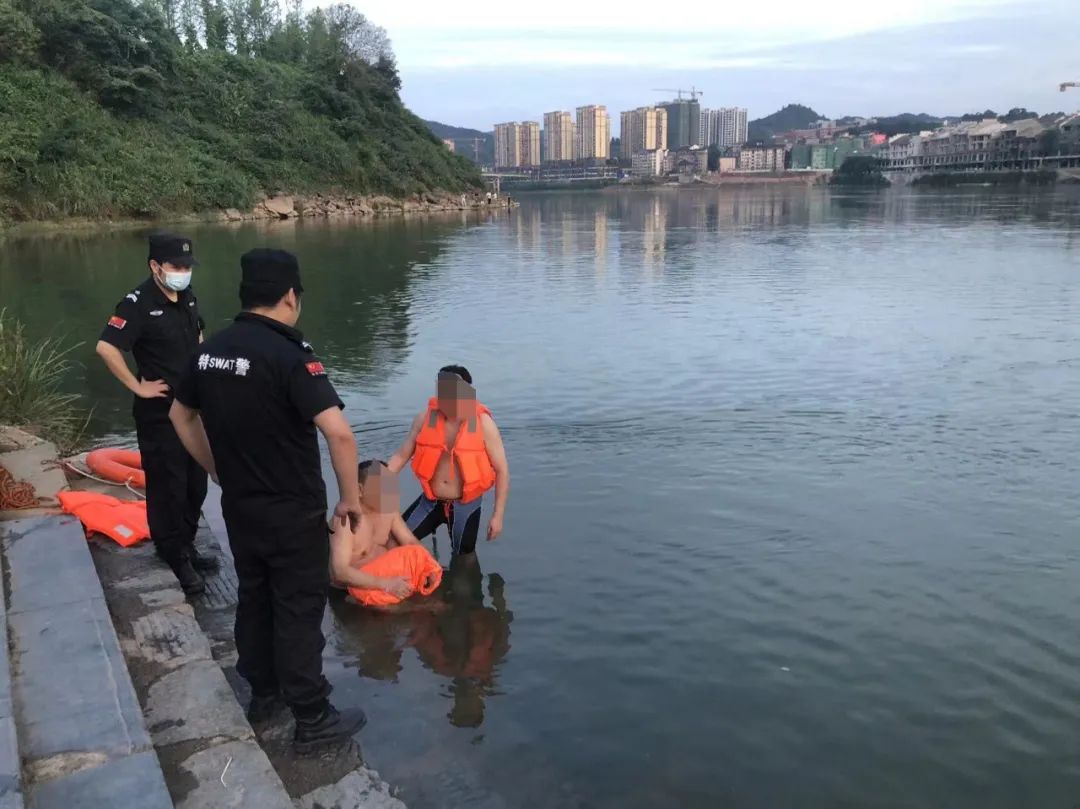 民辅警携带救生装备配合现场热心群众成功将溺水男子营救上岸