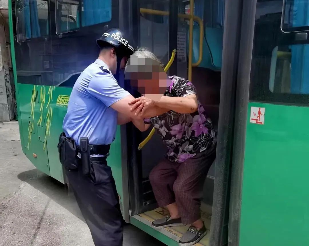 民警接到群众求助电话,赶往现场帮助公交车上患病的老人回家