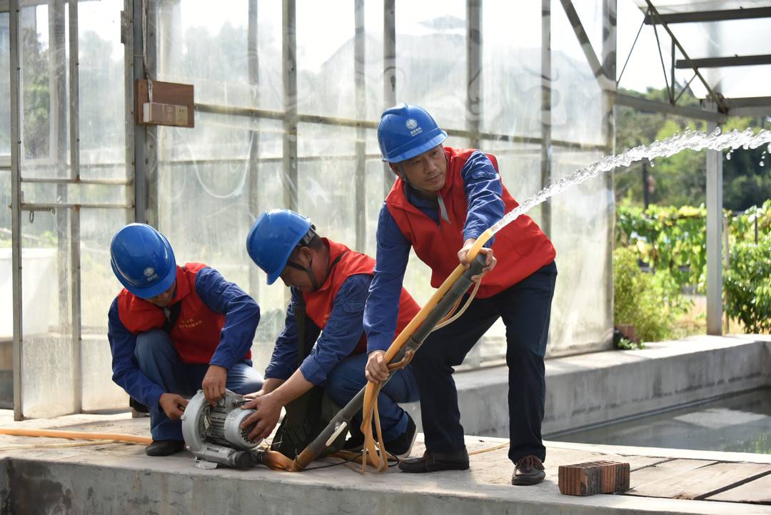 经过30多分钟的紧张作业,受损电缆更换完成,服务队员汗水浸透了全身。启动配电箱开关,抽水机发出轰鸣声响,从地下100多米深处抽出的水温为10度左右的凉水注入鲥鱼池。