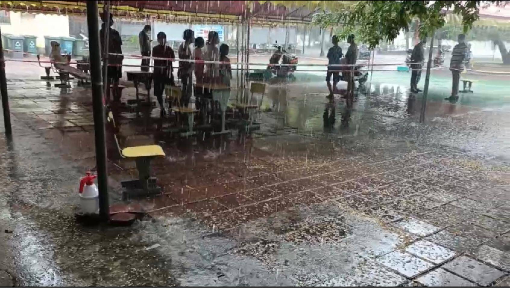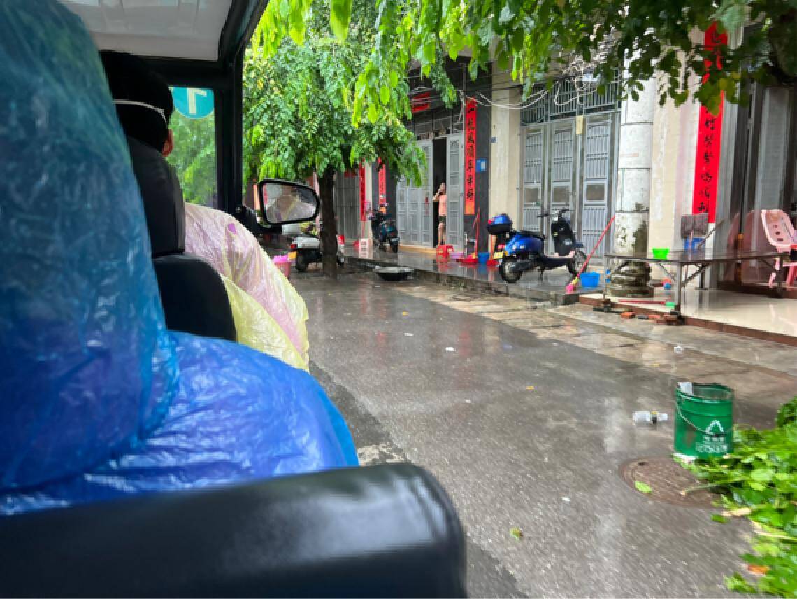 8月10日是我们来到排浦镇核酸采样的第一天,正好遇到下暴雨,采样地点设置在了车棚,豆点大的雨点打得棚顶噼里啪啦作响。地方镇政府的工作人员冒着大雨在车棚底下临时搭建了几条核酸采样通道,志愿者们忙着物资,我们忙着穿防护服,迅速到位,立即开展工作。