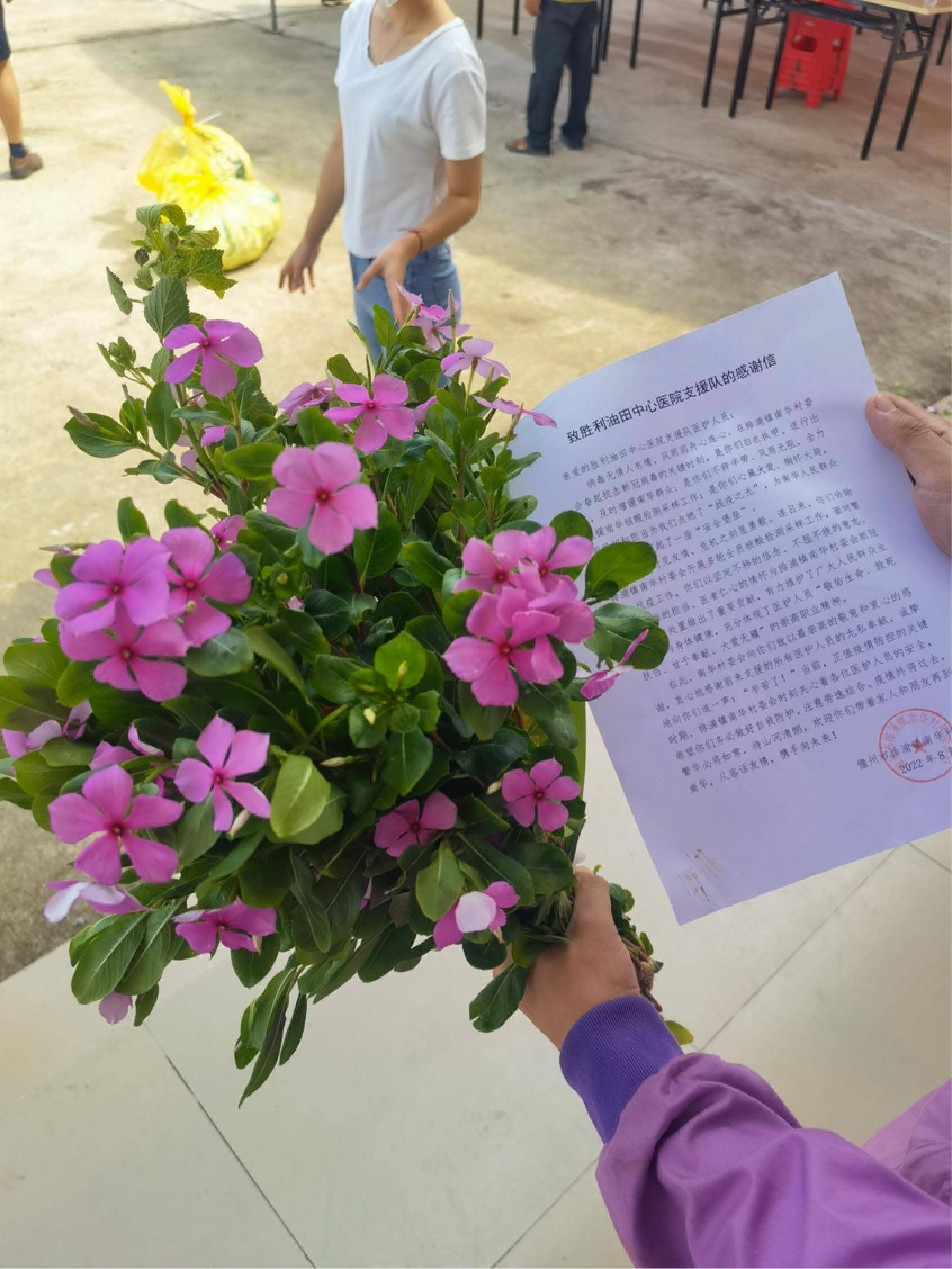 随着工作有序开展,渐渐地我们也变得熟悉起来,虽然语言上有点差别,但是不妨碍我们交流。最让我们感动的是,有一天结束采样工作,南华村卫生室的一位小姑娘拿着自己做的花束送给我们:“这里是我的家,我待的村,谢谢你们不远千里的来帮助我们。”听完这句话,我感觉做再多的工作我们都值了!