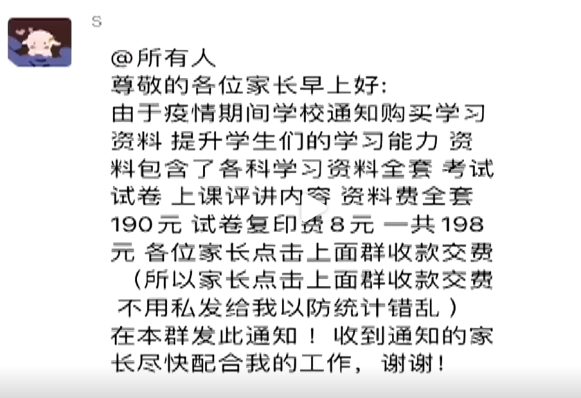 “S老师”发消息假称:学校通知购买学习资料,资料费全套190元,试卷复印费8元,一共198元,各位家长点击群收款交费,收到通知的家长尽快配合工作。