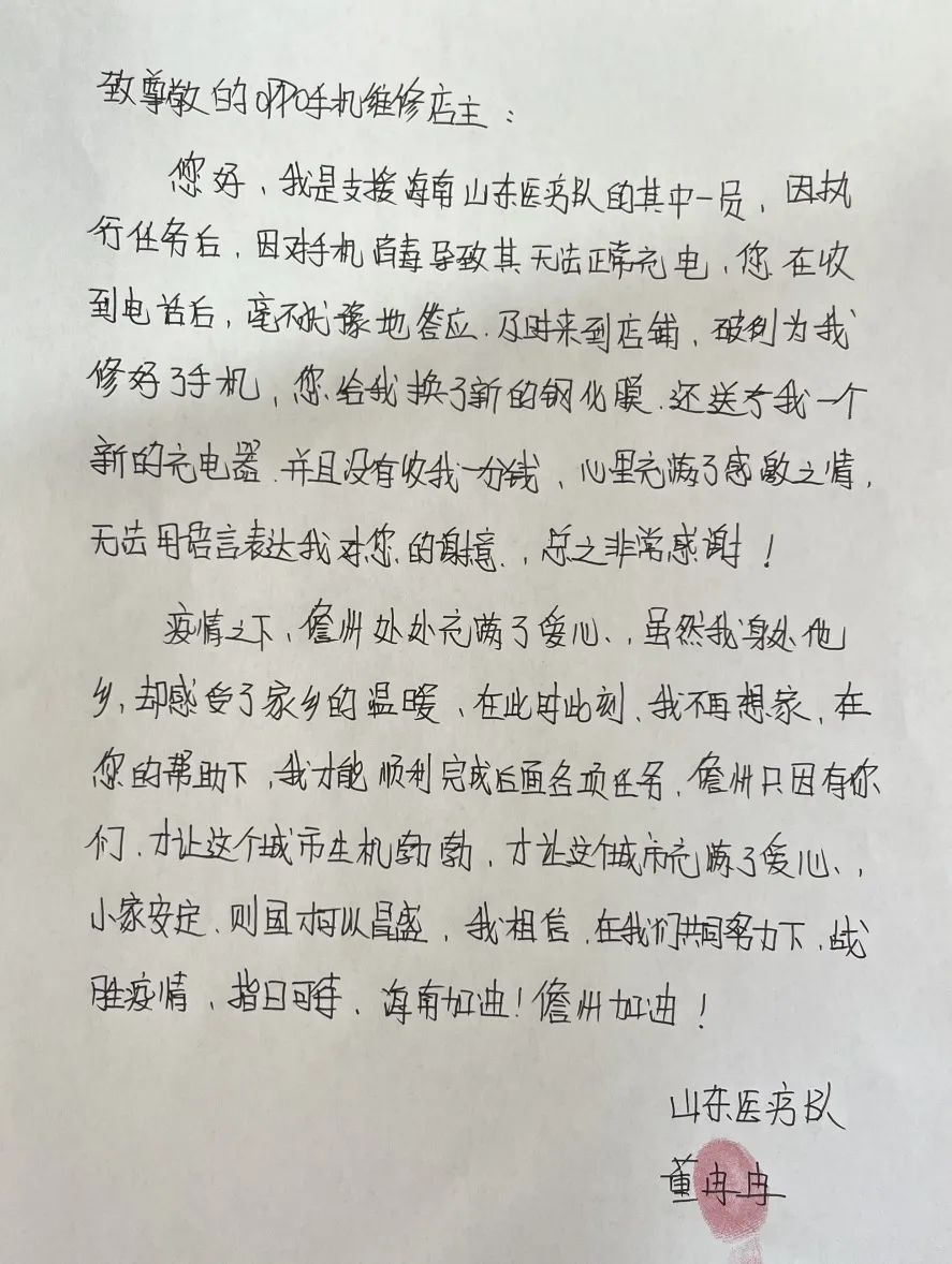 “尊敬的手机维修店主,您好,我是支援海南山东医疗队的其中一员,因对手机消毒导致其无法正常充电,您在接到电话后,毫不犹豫地答应及时来到店铺,破例为我修好了手机,您给我换了新的钢化膜,还送了我一个新的充电器,并且没有收我一分钱,心里充满了感激之情,无法用言语表达我对您的谢意,总之非常感谢……”