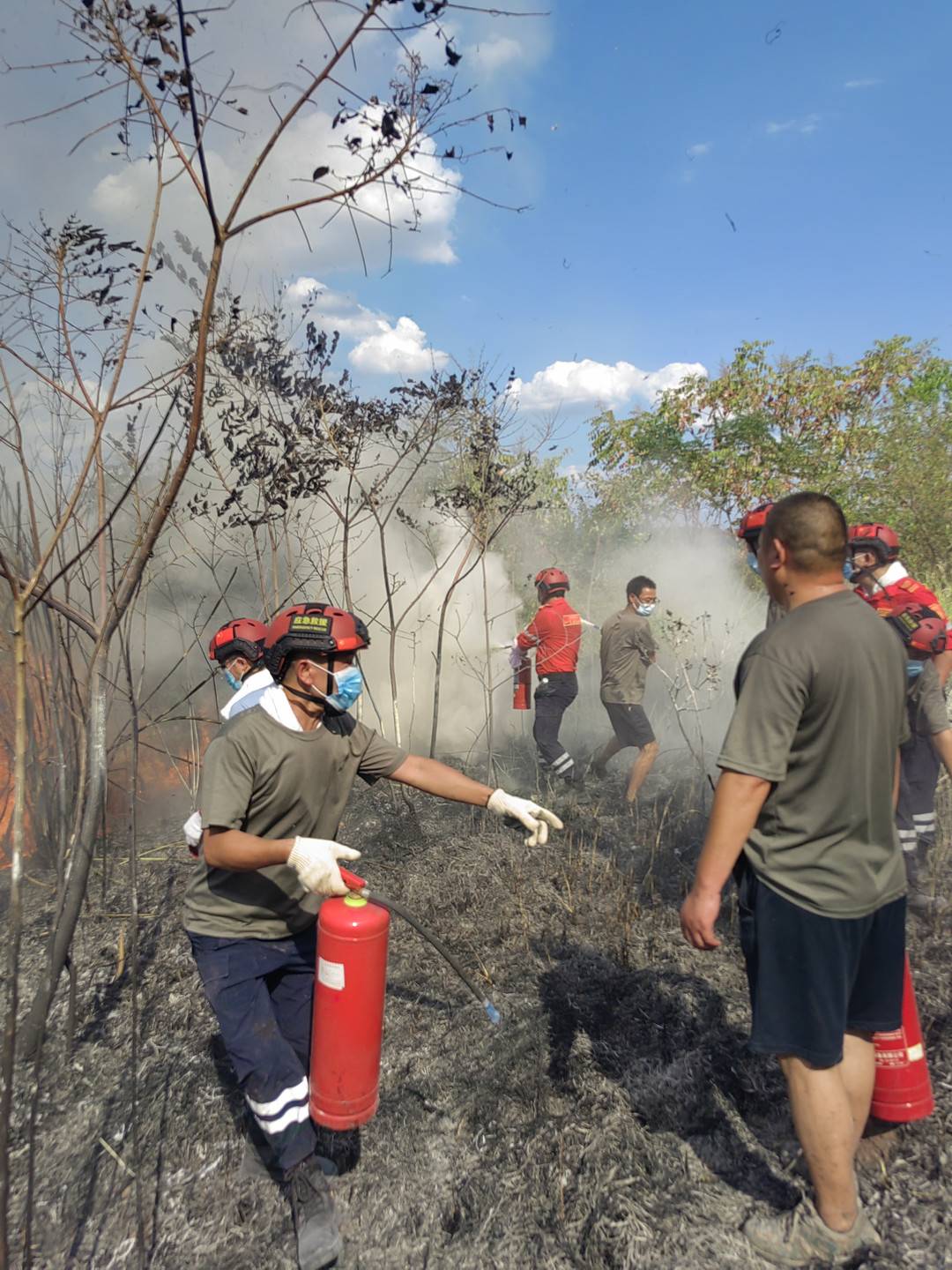 拿着灭火器、灭火弹、灭火拍、铁铲,油锯……“云振情先锋队”、银城应急救援队队员们上山,与消防队员一起战斗。3个多小时后,山火基本被扑灭。然后以3人一组,上山巡逻,清除余火烟点。