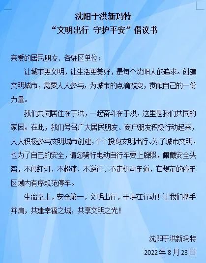 作为文明出行积极参与的优秀企业代表,于洪新玛特一直在努力践行,积极配合,今天这封家书送给于洪新玛特,让我们共治共享、共情共行!