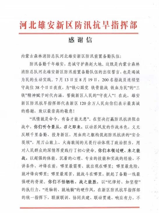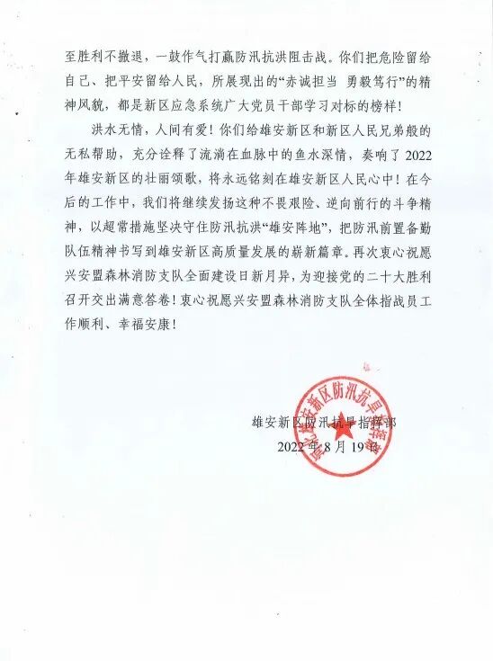 信中讲到,洪水无情,人间有爱!你们给雄安新区和新区人民兄弟般的无私帮助,充分诠释了流淌在血脉中的鱼水深情,奏响了2022年雄安新区的壮丽颂歌,将永远铭刻在雄安新区人民心中!