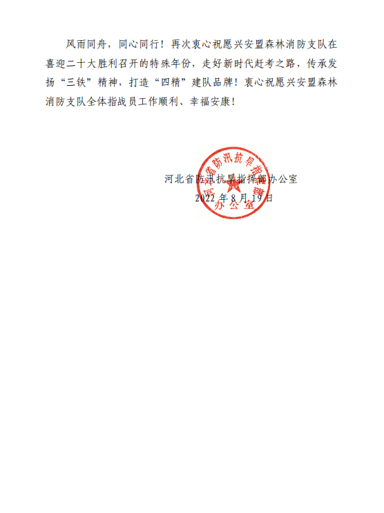 信中讲到,在前置备勤我县过程中,全体指战员听从指挥、坚守战位,赢得了全县干部群众的广泛赞誉。你们以实际行动生动诠释了“铁心跟党、铁血为民、铁骨能战”的“兴安铁军”精神,全面助力了我县防汛工作,为保护我县人民群众生命财产安全作出了突出贡献。