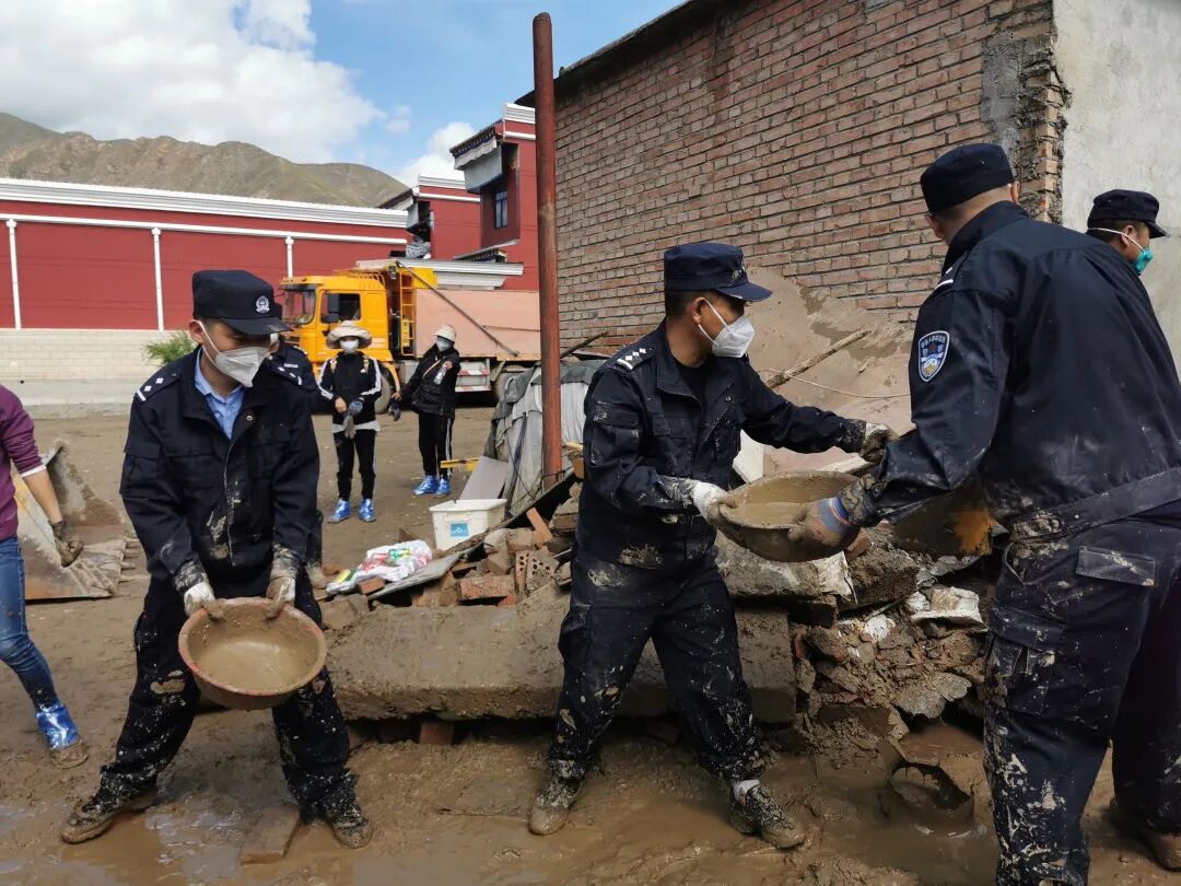 8月21日晚,夏河县出现暴雨,引发洪涝、泥石流等自然灾害,拉卜楞镇九甲行政村7个自然村以及部分乡镇不同程度受灾。灾害发生后,夏河县公安局全体民警辅警迅速行动,清淤排危、疏堵保畅,守护群众生命财产安全。吕欣峰摄