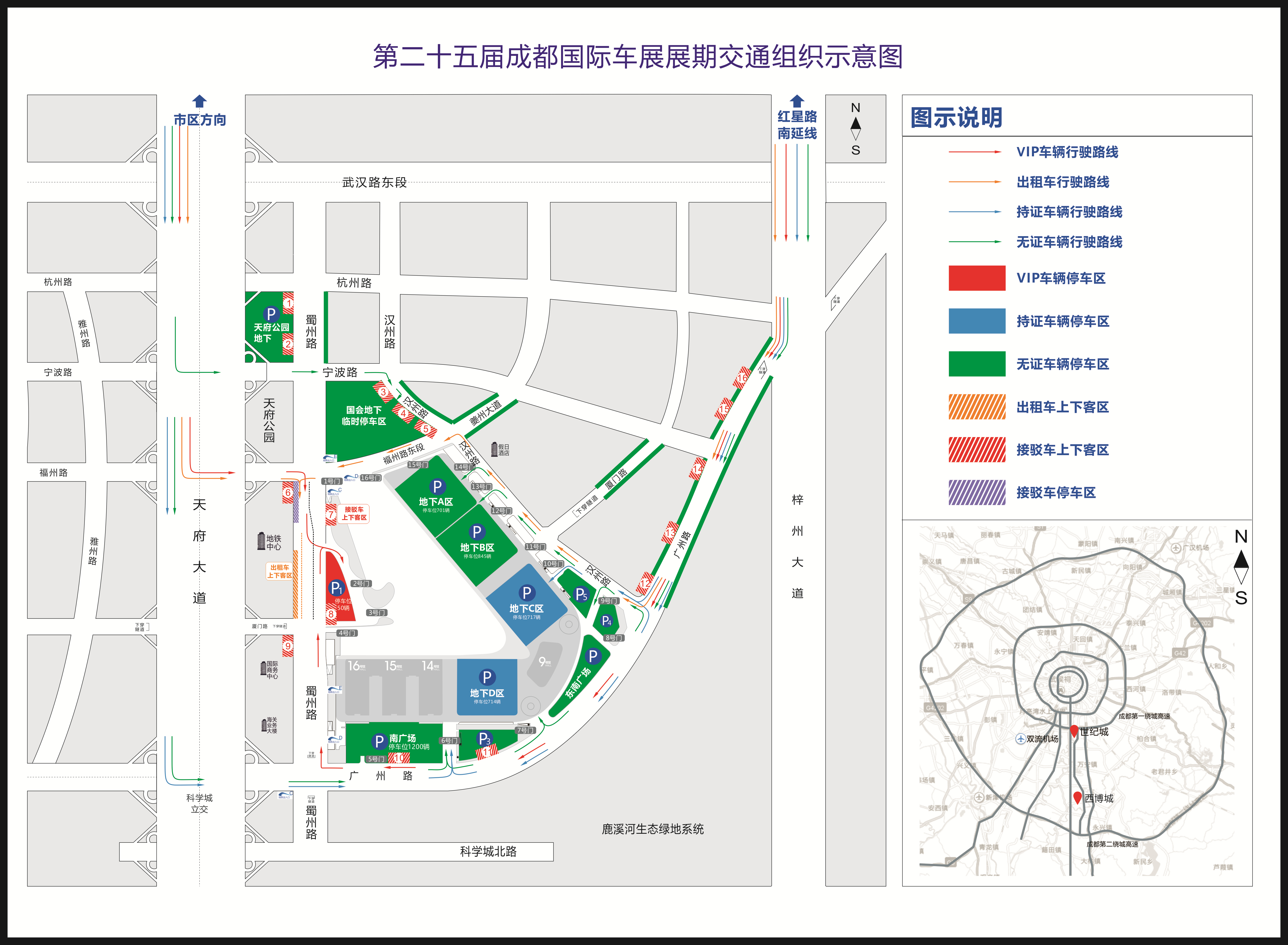 第二十五届成都国际车展将于2022年8月26日至9月4日在中国西部国际博览城(以下简称西博城)举办。为方便广大市民朋友前往观展,成都天府公安为大家整理出了观展期间西博城的行车、停车指南。