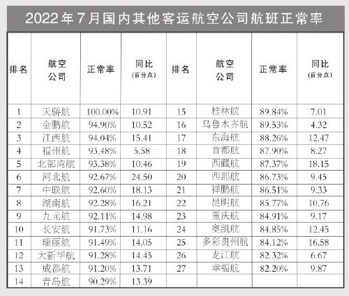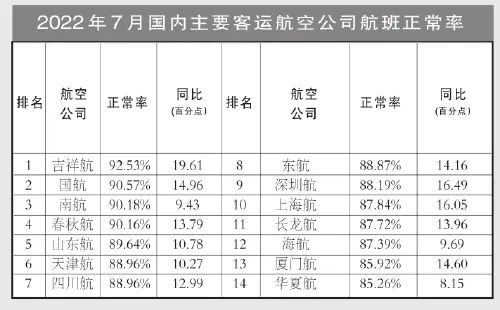 2021年执行的航段班次占国内客运航空公司总航段班次2%(含)以上的航空公司为国内主要客运航空公司。执行的航段班次占国内客运航空公司总航段班次2%(含)以下的航空公司为国内其他客运航空公司。2022年7月国内客运航空公司平均航班正常率89.09%,同比上升12.87个百分点。