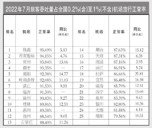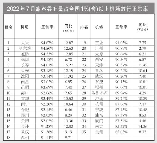 国内主要机场按照2020年旅客吞吐量划分,分为旅客吞吐量占全国1%(含)以上机场及0.2%(含)至1%(不含)机场。2022年7月国内主要机场平均放行正常率90.44%,同比上升9.42个百分点。