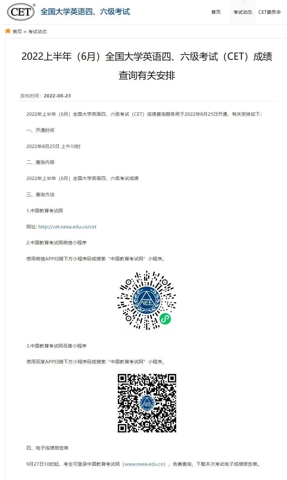 1. 自2021年上半年考试起,CET将免费提供电子成绩报告单(小语种科目为电子证书)。本次电子成绩报告单:9月27日10时起,考生登录中国教育考试网(www.neea.edu.cn)查看并下载电子成绩报告单,电子成绩报告单与纸质成绩报告单同等效力。