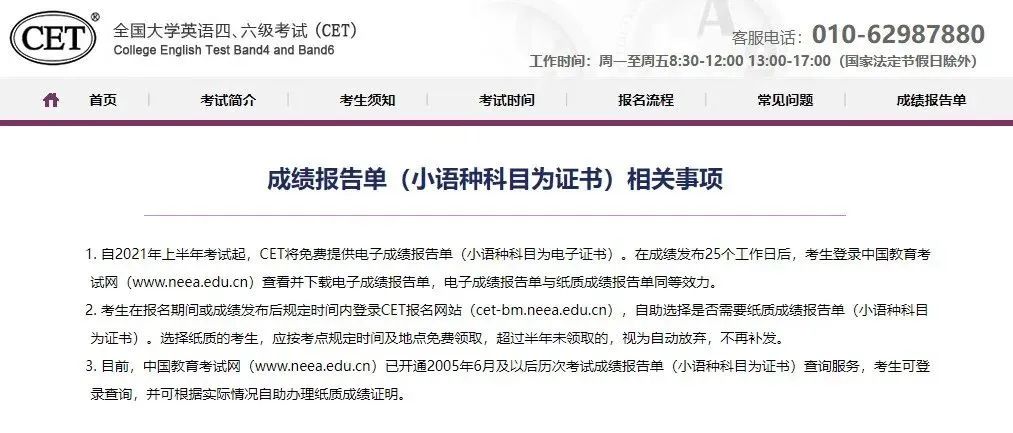 2. 考生在报名期间或成绩发布后规定时间内登录CET报名网站(cet-bm.neea.edu.cn),自助选择是否需要纸质成绩报告单(小语种科目为证书)。选择纸质的考生,应按考点规定时间及地点免费领取,超过半年未领取的,视为自动放弃,不再补发。