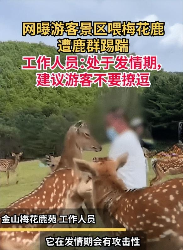 商家表示梅花鹿处于发情期,游客投喂时最好不要撩逗,现在梅花鹿头上的都是鹿茸,而且梅花鹿一般不会伤人,有的游客拿着食物撩逗,可能才会出现踢踹的现象,这种事情很少。毕竟动物习性不可控,如果发生这种情况,游客走远一点就行。