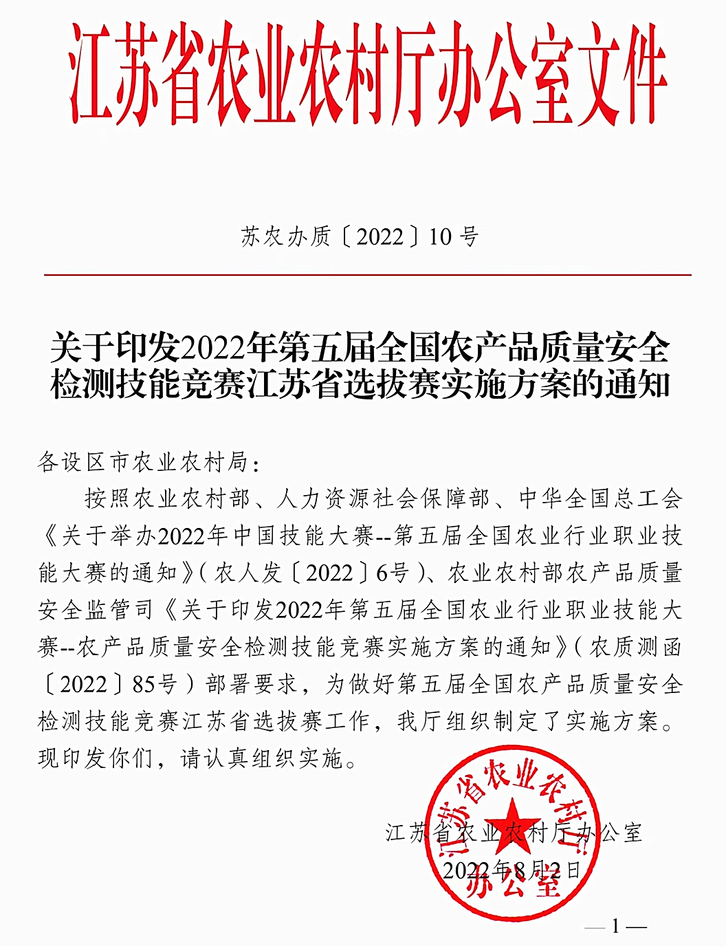 8月18-20日,第五届全国农产品质量安全检测技能竞赛江苏选拔赛在镇江句容市成功举办。此次竞赛由省农业农村厅、省人力资源和社会保障厅、省总工会联合主办,省农产品质量检验测试中心、省畜产品质量检验测试中心、省水产质量检测中心、江苏农林职业技术学院承办。