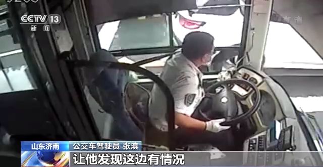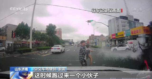 公交车驾驶员 张滨:当时小男孩愣在那里,这时候跑过来一个小伙子把他抱起来伸手表示感谢。