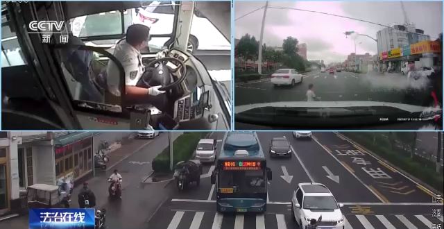 公交车驾驶员 张滨:当时前方是绿灯,我正好经过路口减速,看到小孩穿马路,我就停下了。看到小孩在那愣了一会儿,还往左边走,我担心后面小车看不见,伸出手给后面车示意,让他发现这边有情况。害怕(白色私家车)停不下来,我使劲伸手呼喊,白车看到我的示意,紧急停下,离那小孩也就20多厘米。