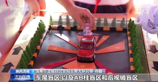 陕西省渭南市澄城县公安局交警大队民警 刘敏:因为我们小孩子身高比较低,如果蹲在车辆前面或后面的话,司机叔叔肯定是看不到的。因为司机叔叔坐在车里之后,由于汽车结构的影响,他肯定(有)在里边看不到外面的地方。那它的盲区一共就分为车前盲区、车尾盲区以及AB柱盲区和后视镜盲区。通过今天的小实验就想告诉小朋友们,在马路上一定不要在车辆的周围玩耍,也不要在马路上逗留。