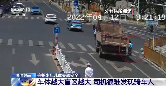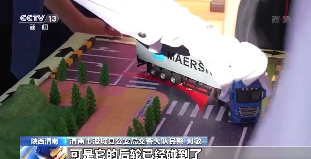 陕西省渭南市澄城县公安局交警大队民警 刘敏:它的前轮没有碰到,可是它的后轮已经碰到了,大家知道为什么吗?因为它的前轮和后轮的(转弯)半径是不同的。所以它会产生内轮差,这也是大货车盲区中最危险的一个。所以我们在路上看到大货车时一定要远离。