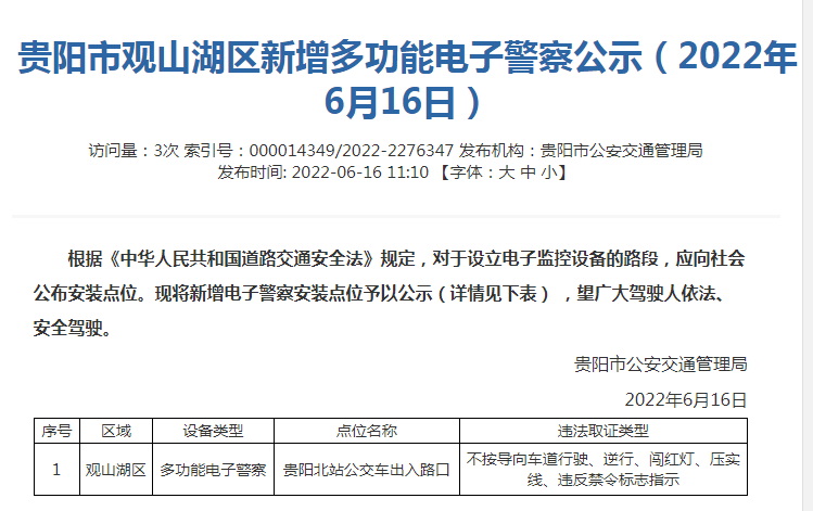 今年4月,贵阳交管部门将此处路段摄像头调整为“电子警察”摄像头,于6月16日起对社会进行为期7天的公示后,启动“电子警察”抓拍工作,通过监控抓拍系统对违法占道的车辆进行抓拍处罚。