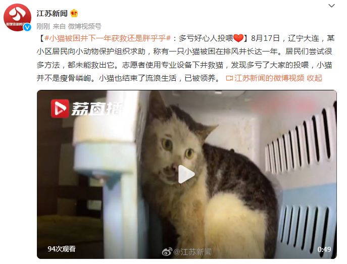 8月17日,辽宁大连,某小区居民向小动物保护组织求助,称有一只小猫被困在排风井长达一年。居民们尝试很多方法,都未能救出它。志愿者使用专业设备下井救猫,发现多亏了大家的投喂,小猫并不是瘦骨嶙峋。小猫也结束了流浪生活,已被领养。