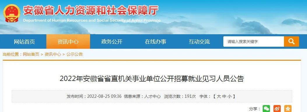 今日上午,安徽省人社厅网站发布2022年安徽省省直机关事业单位公开招募就业见习人员公告