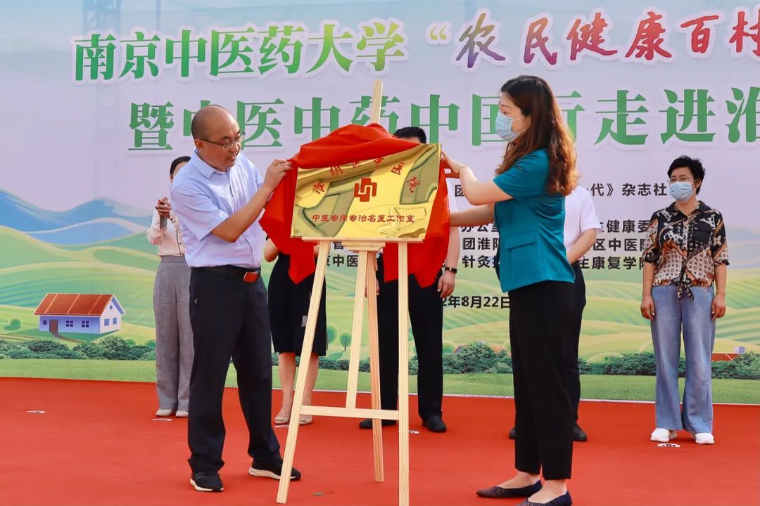 南京中医药大学组织部常务副部长王珏与淮阴区卫健主任委吴洪乐为淮阴区中医院“中医专病专治名医工作室”揭牌。省红十字会组织宣传部部长丁玉琴与江苏省第十五批科技镇长团淮阴团团长张丽丽为南京中医药大学“农民健康百村工程实践基地”揭牌。