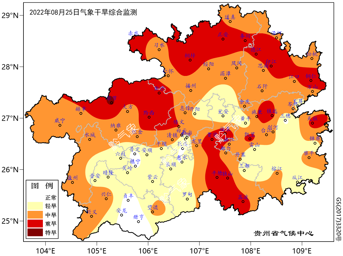 据贵州省气候中心气象干旱综合监测,截止到2022年8月25日,贵州省出现特旱1站(七星关),重旱19站(黔西、金沙、赤水、桐梓、正安、务川、德江、印江、碧江、天柱、镇远、施秉、凯里、福泉、贵定、平塘、独山、荔波、修文),其中施秉为新增,中旱37站,轻旱17站;中旱以上区域主要分布在毕节市、遵义市、铜仁市、黔东南州北部及局地、黔南州中东部、黔西南州西部和东部、六盘水市西部等地。