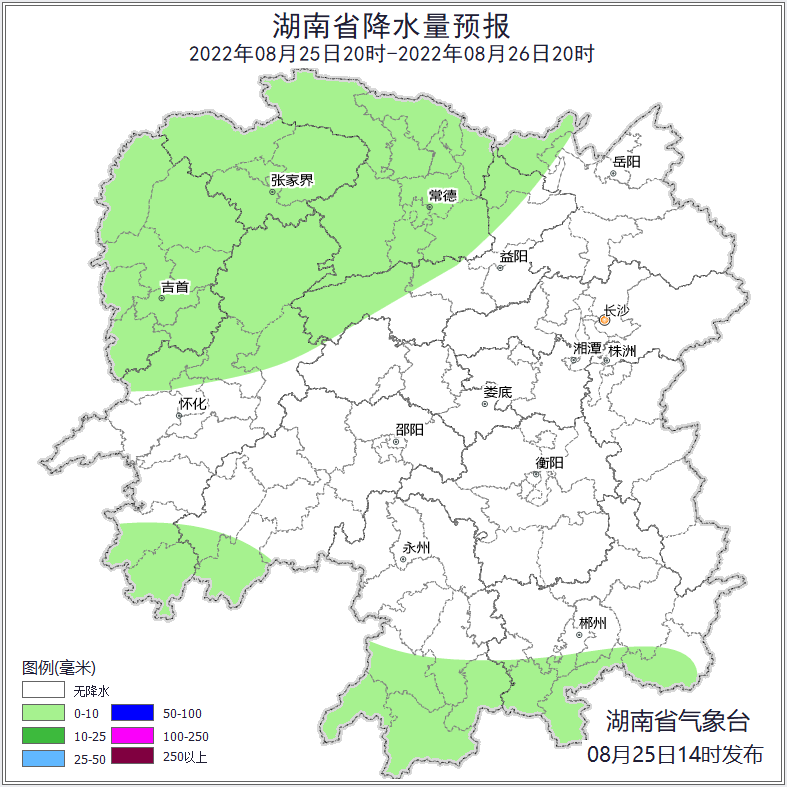 25日晚受“马鞍”台风外围云系影响,湘西、湘南部分地区有阵雨或雷阵雨;26日至29日白天受副高控制,省内晴热高温天气发展;29日晚至31日,省内自北向南有中等强度降雨过程。