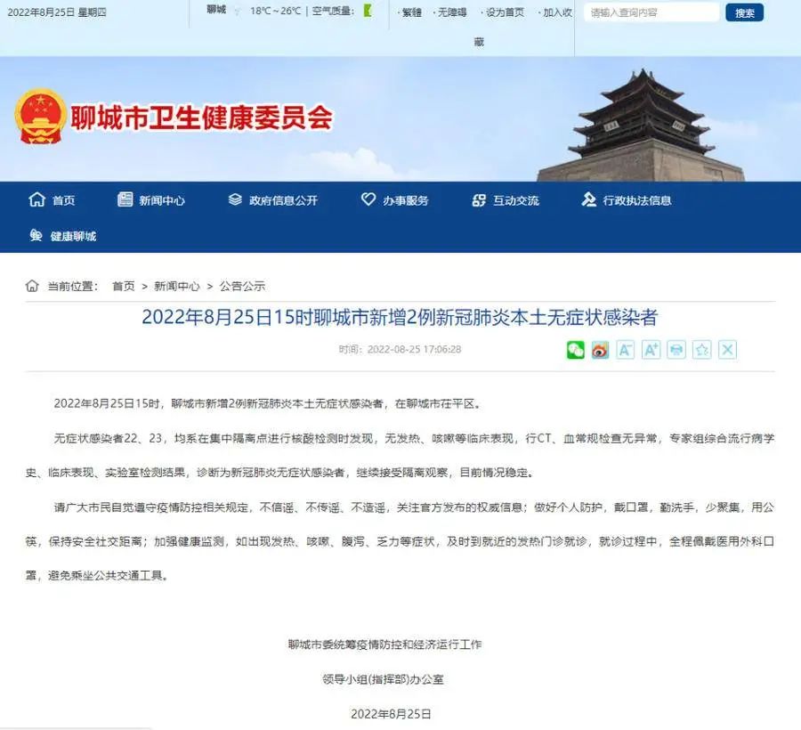 2022年8月25日15时,聊城市新增2例新冠肺炎本土无症状感染者,在聊城市茌平区。