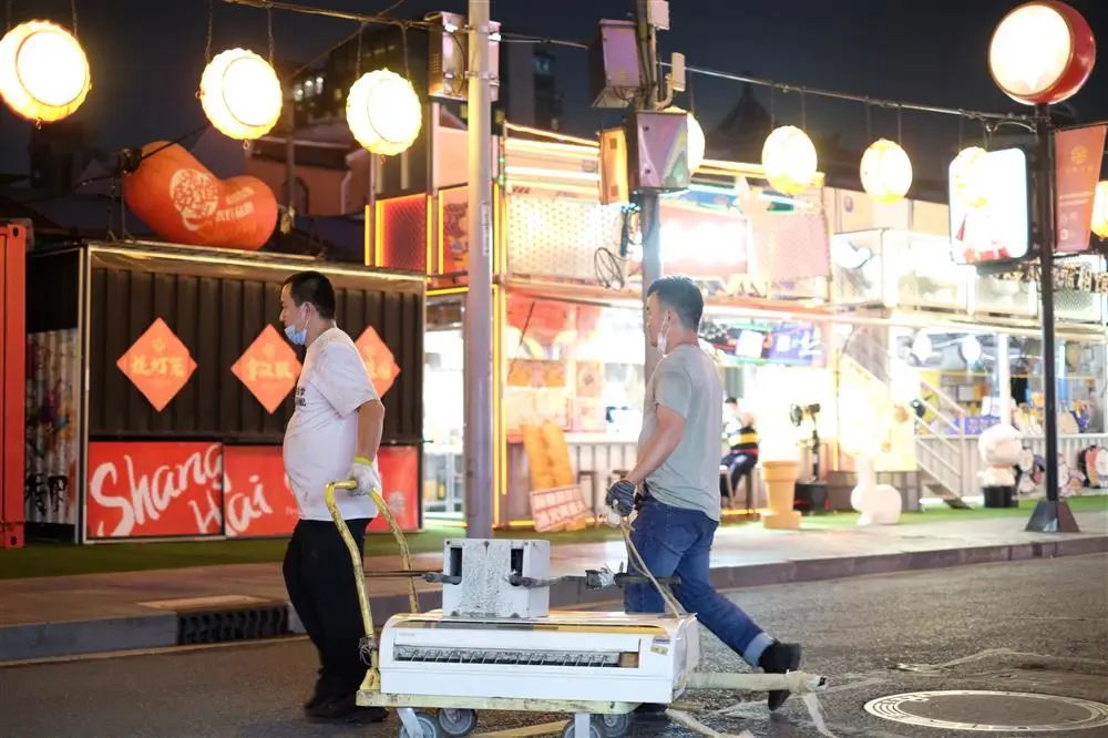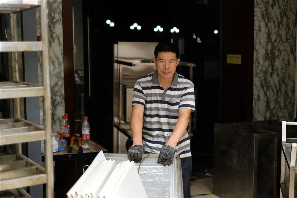 冯国廷和工人们正在搬运待回收的餐饮设备。朱凌君摄