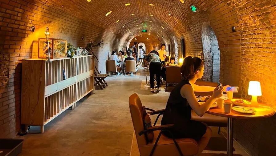 如今,尽管窑洞制砖工艺早已淡出人们的视线,但被完整保留下来的高大烟囱和一组组大小不一的拱形门洞,仍向来者诉说着那个火热年代的荣光。前来就餐的大人和孩子,也无一例外会以此为背景,拍下一张张照片留念。