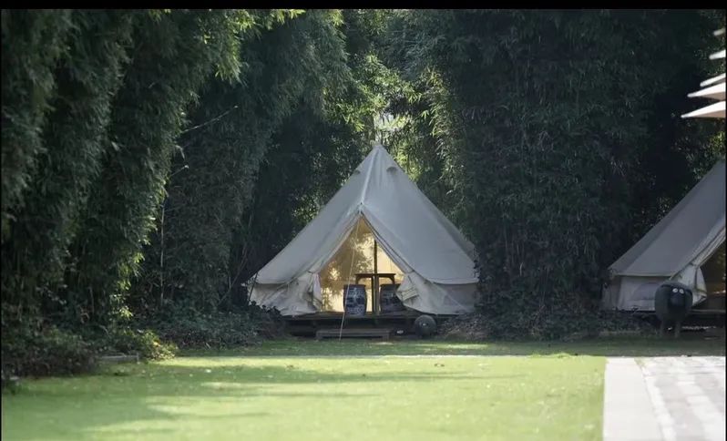 几年前陶家宅一号店的走红,一定程度上与其在室外空间搭设了露营帐篷有关。当时,陶家宅店在院内大草坪上搭了几顶白色帐篷,放置了小桌子和垫子,作为特别的景观位。很快,它们就成了店里最难抢的位子。“抢到的人都觉得很幸运,没抢到的只能下次赶早,提前守着。”