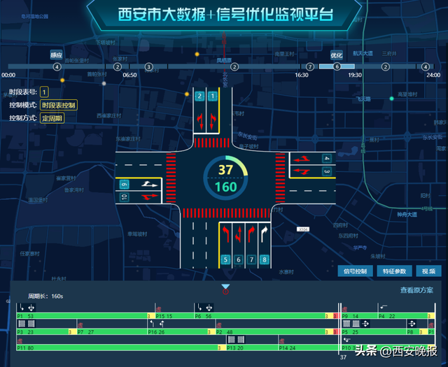 据介绍,优化前,该路口信号灯配时方案只有白天与夜间两种,但实际情况是白天高峰与平峰之间的车流量变化较大,工作日与非工作日流量变化也大,一套日间配时方案无法满足多种变化的需求。粗放的配时方案导致白天时段路口信号周期过大,存在绿灯损耗,高峰时段路口失衡现象明显,晚高峰时段、节假日白天时,北向南方向拥堵尤其严重。