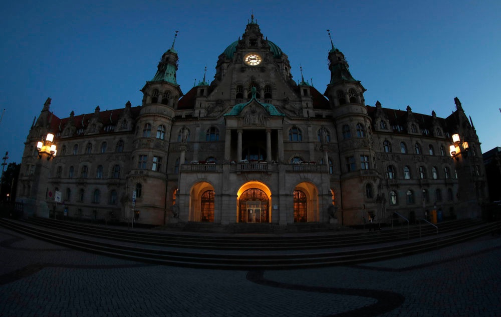为应对能源紧张,德国多地采取措施节约用电。这是8月1日晚拍摄的汉诺威市政厅。新华社发(约阿希姆·谢尔斯基摄)