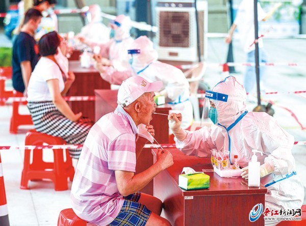 晋江新闻网8月26日讯 厚重的防护服下是一件件汗水浸透的衣衫,紧紧包裹在乳胶手套里是一双双发白肿胀的手,严丝合缝的面罩后是一张张布满勒痕的脸……昨日,晋江市开展全员核酸检测工作,全市6218名医护人员“全副武装”坚守在疫情防控一线,他们战高温斗酷暑,用心用情守护群众健康。