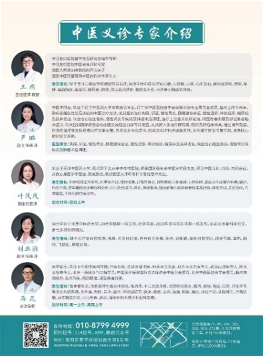 王燕主任是国家中医药管理局中医内科学术带头人,临床经验丰富,专注心脑血管疾病研究与治疗,尤其善于运用中医中药治疗冠心病、心肌缺血、颈动脉斑块、脑供血不足等心脑血管疾病。叶茂茂副主任医师力求精准、个体化的中医诊疗,在脾胃不调、慢性咳嗽、过敏性鼻炎等内科病,小儿脾虚泄泻、抽动症等儿科疾病有丰富的经验。