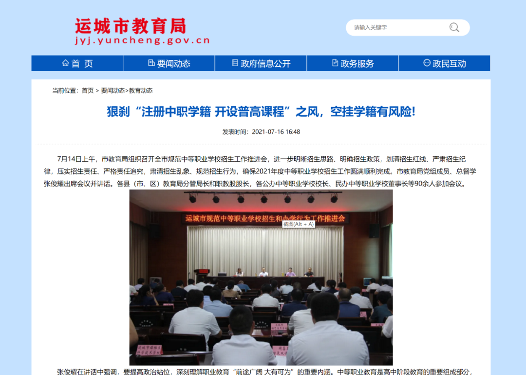 目前,在运城市教育局官网教育动态栏目中,还显示着一篇《狠刹“注册中职学籍,开设普高课程”之风,空挂学籍有风险!》的文章,内容涉及运城推进职业教育过程中出现的问题。