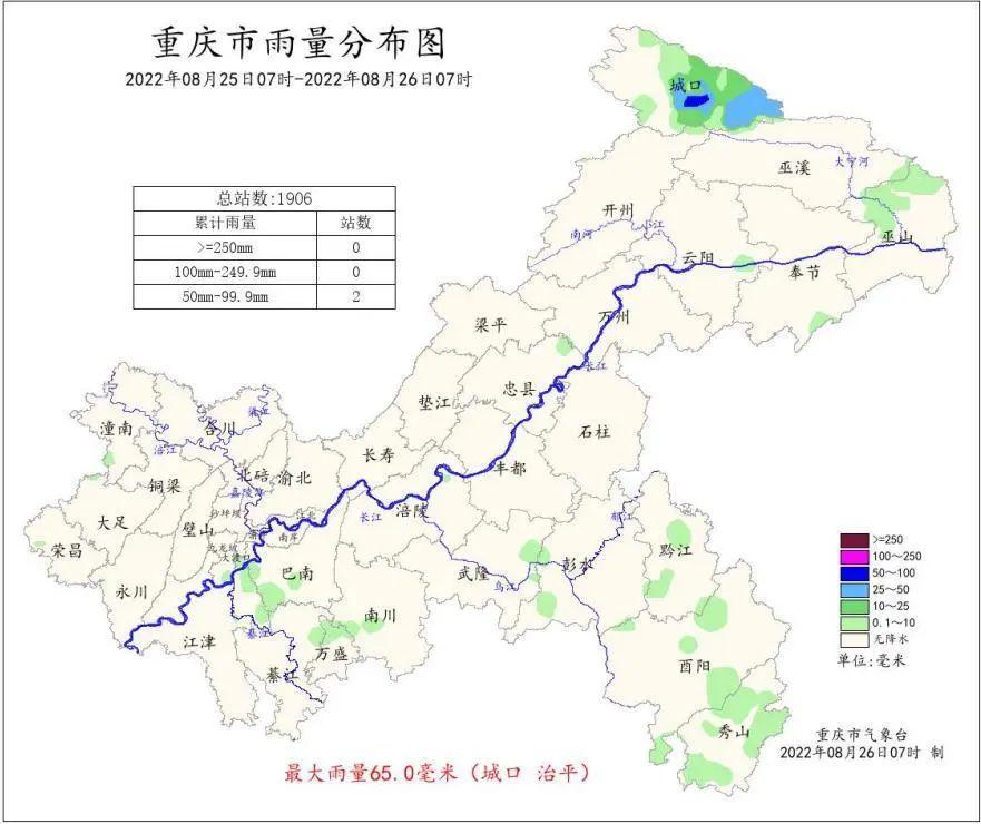 8月25日7时—26日7时,城口县部分地区出现中雨到大雨,局地暴雨,其中2个雨量站达暴雨,最大雨量65.0毫米(城口县治平);大渡口区、九龙坡区、巴南区、潼南区、大足区、荣昌区、江津区、綦江区、南川区、涪陵区、忠县、开州区、云阳县、奉节县、巫山县、武隆区、彭水县、黔江区、酉阳县、秀山县等20个区县及万盛经开区的局部乡镇出现小雨。