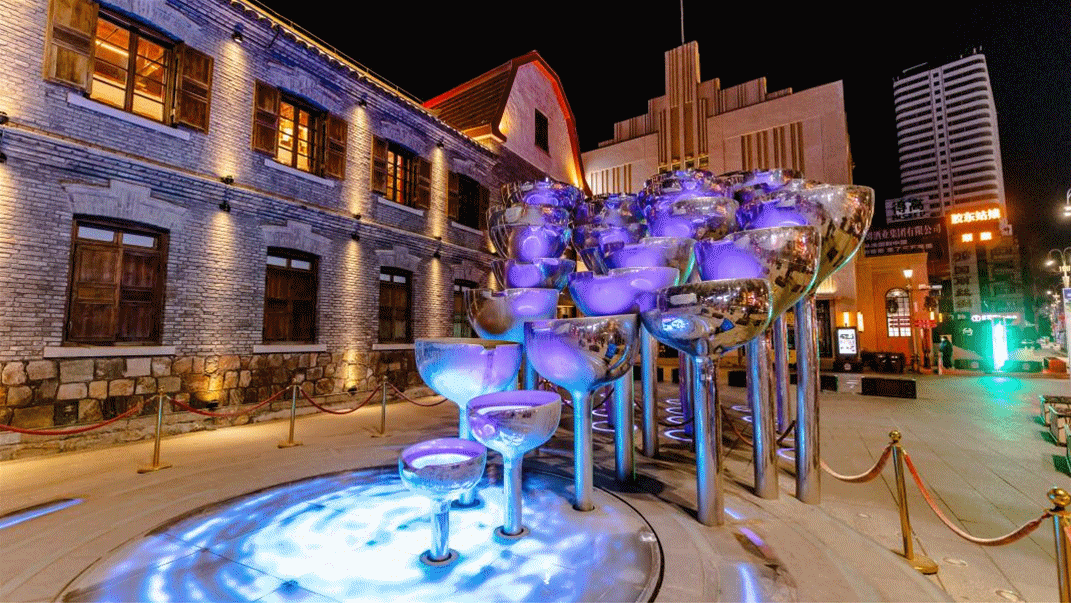 舞动时光雕塑由29个不锈钢镜面酒杯呈阶梯状排列,水流从高处的酒杯中缓缓倾泻而下,仿若入杯的红酒,如甘如醇,伴随音乐的节奏,酒杯升降,佳酿摇曳,如同翩跹的舞姿,烘托街区氛围。七彩流光的紫葡翩舞雕塑演绎出一场精彩绝伦的炫彩葡萄秀。一抹绯红雕塑定格红酒在杯中摇曳的瞬间,如凝结的佳酿,也如美人微醺时颊间飞过的红晕,随着观者靠近,涟漪的光影从地上聚焦到体验者身上,如梦似幻。
