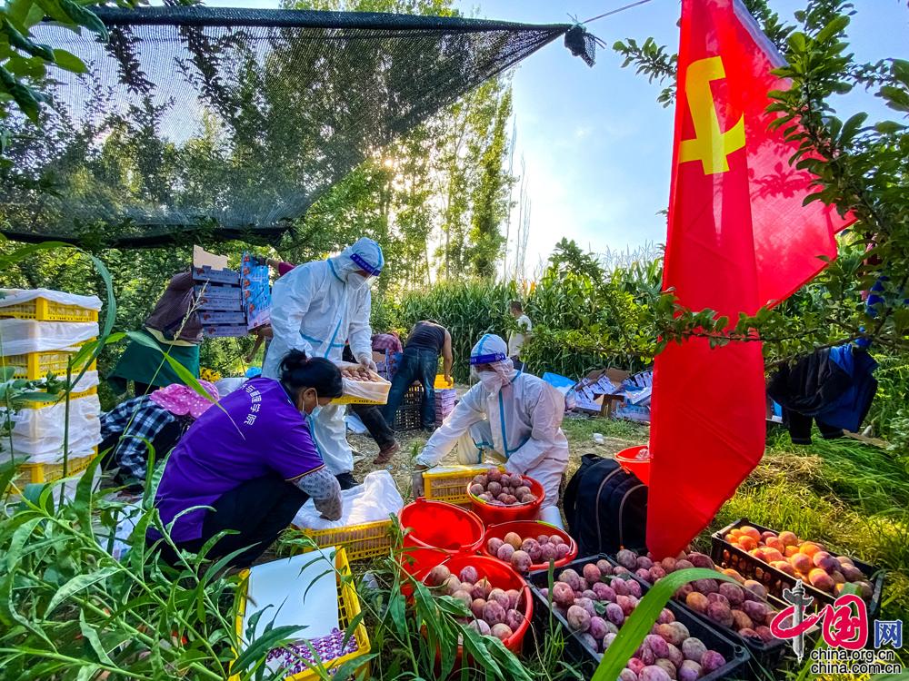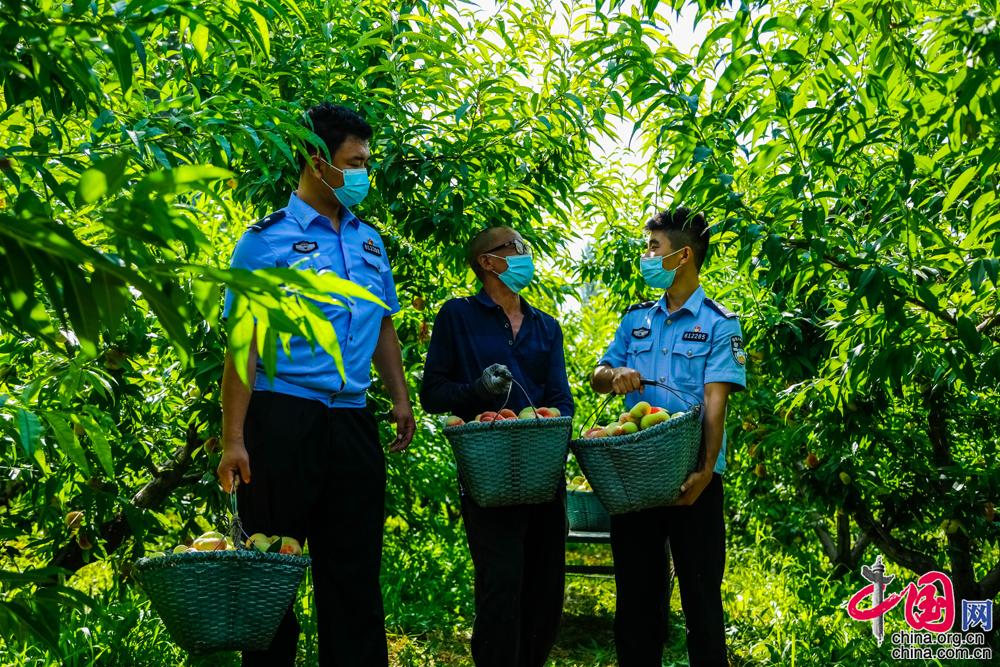 图为受疫情影响,果农水果无法及时采摘销售,民警组成“党员先锋队”助农解难题。