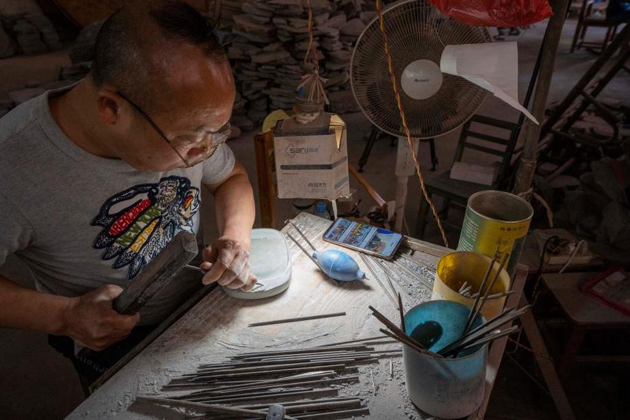 白石村的端砚匠人在制作端砚。 曹笑 摄
