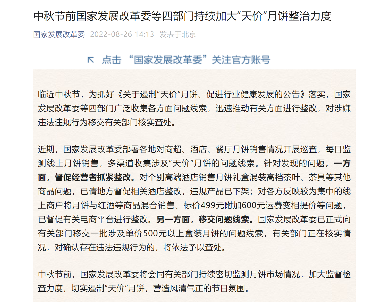 据“国家发展改革委”微信公众号26日消息,中秋节前国家发展改革委等四部门持续加大“天价”月饼整治力度。