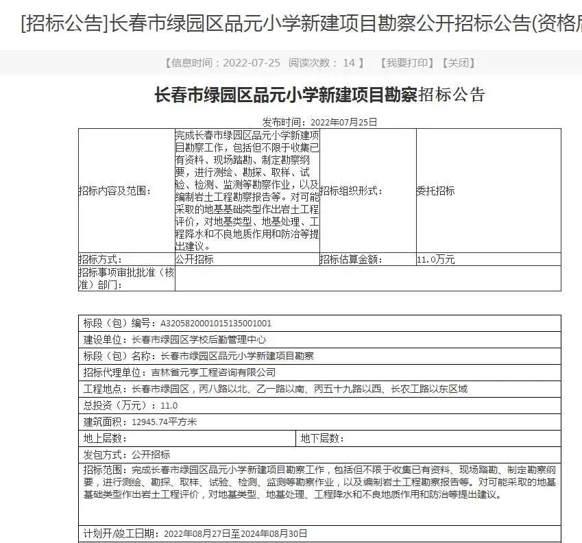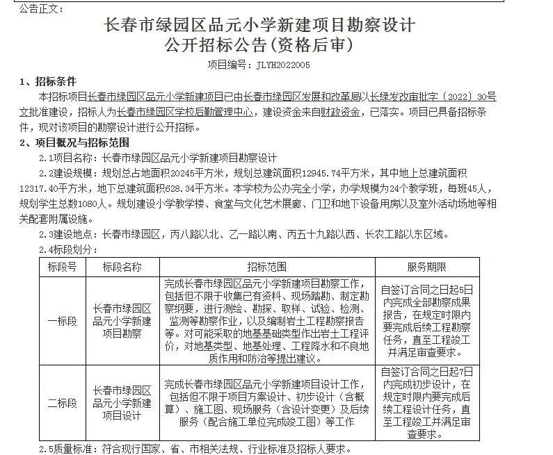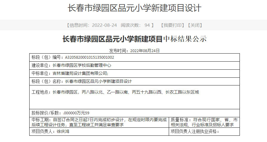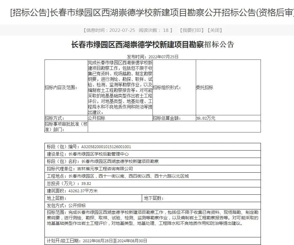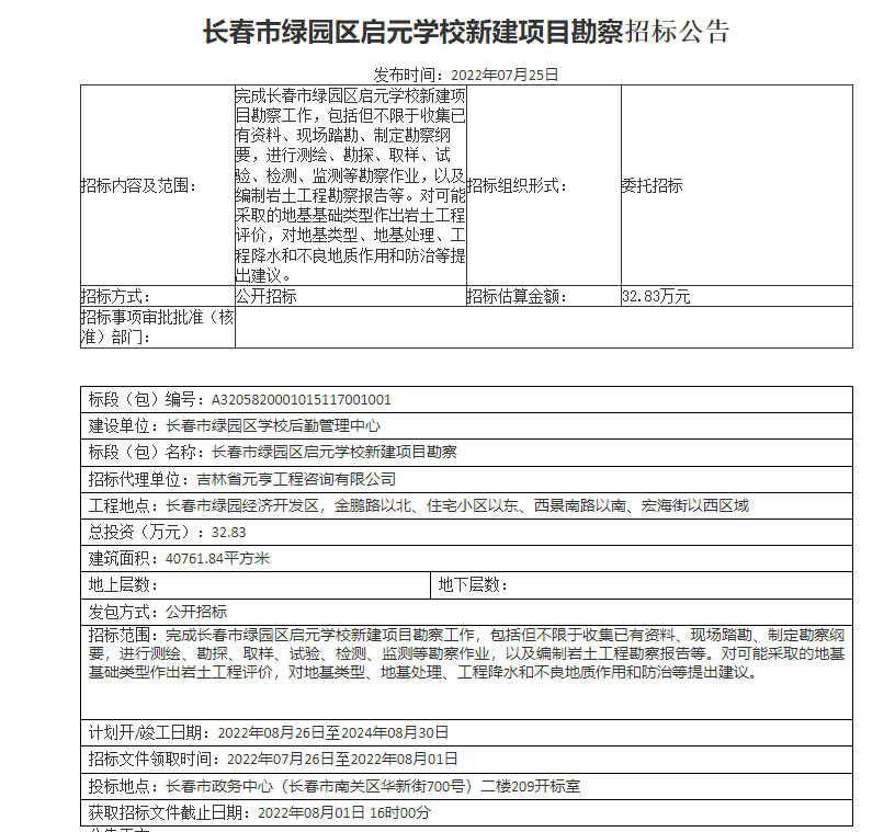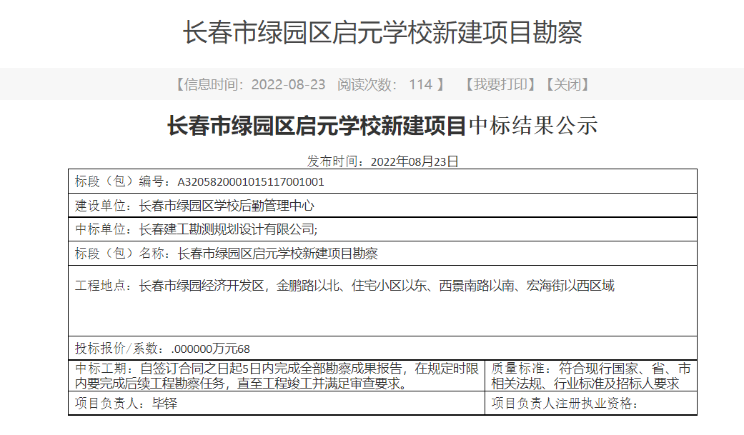 8月23日,长春市公共资源交易网发布绿园区启元学校新建项目勘察中标结果公示。
